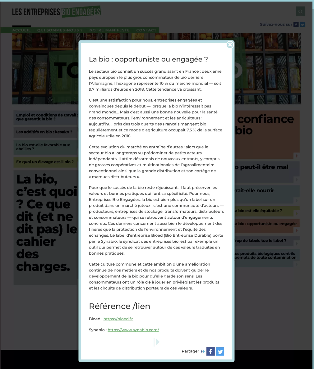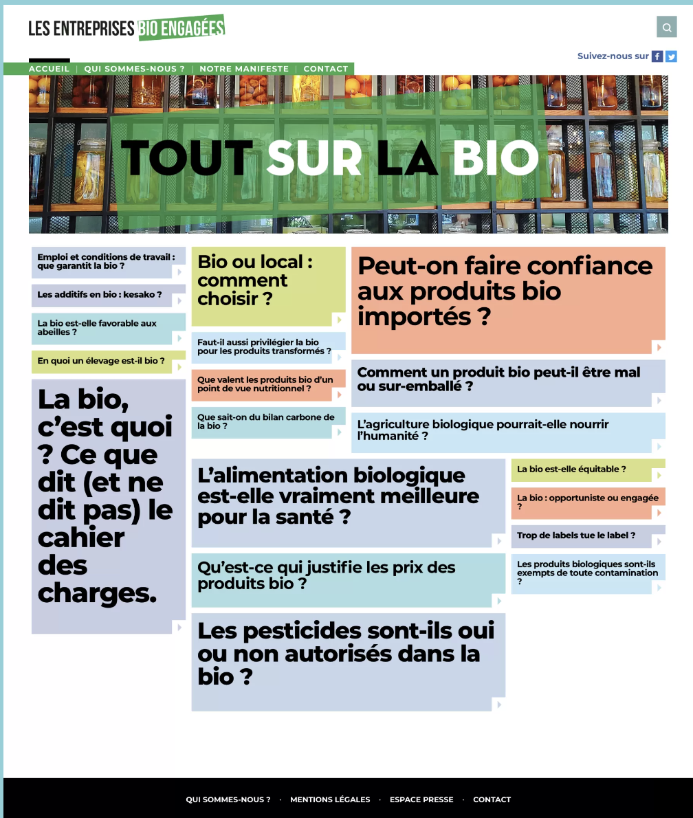 - « Tout sur la bio » / entreprises bio-engagées : rédaction d’un FAQ pédagogique et documenté autour de l’agriculture biologique & ses produits.
