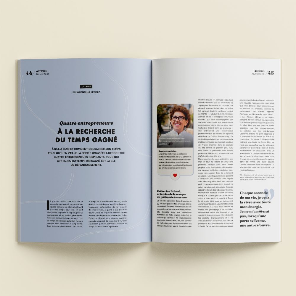 - Presse / Odyssées (2024) : rédaction de la « galerie de portraits » du magazine de développement personnel dédié à l’entrepreneuriat.